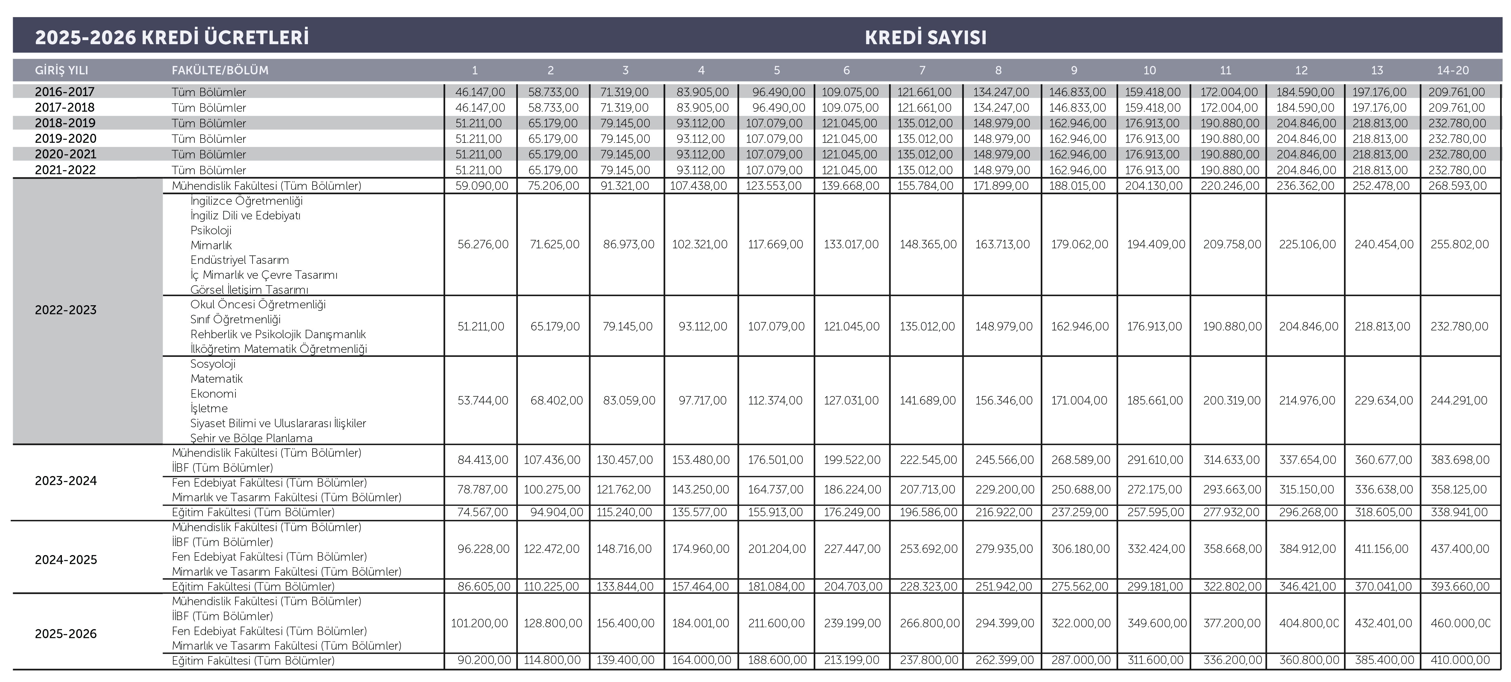 2025-2026 Akademik Yılı Kredi Ücretleri