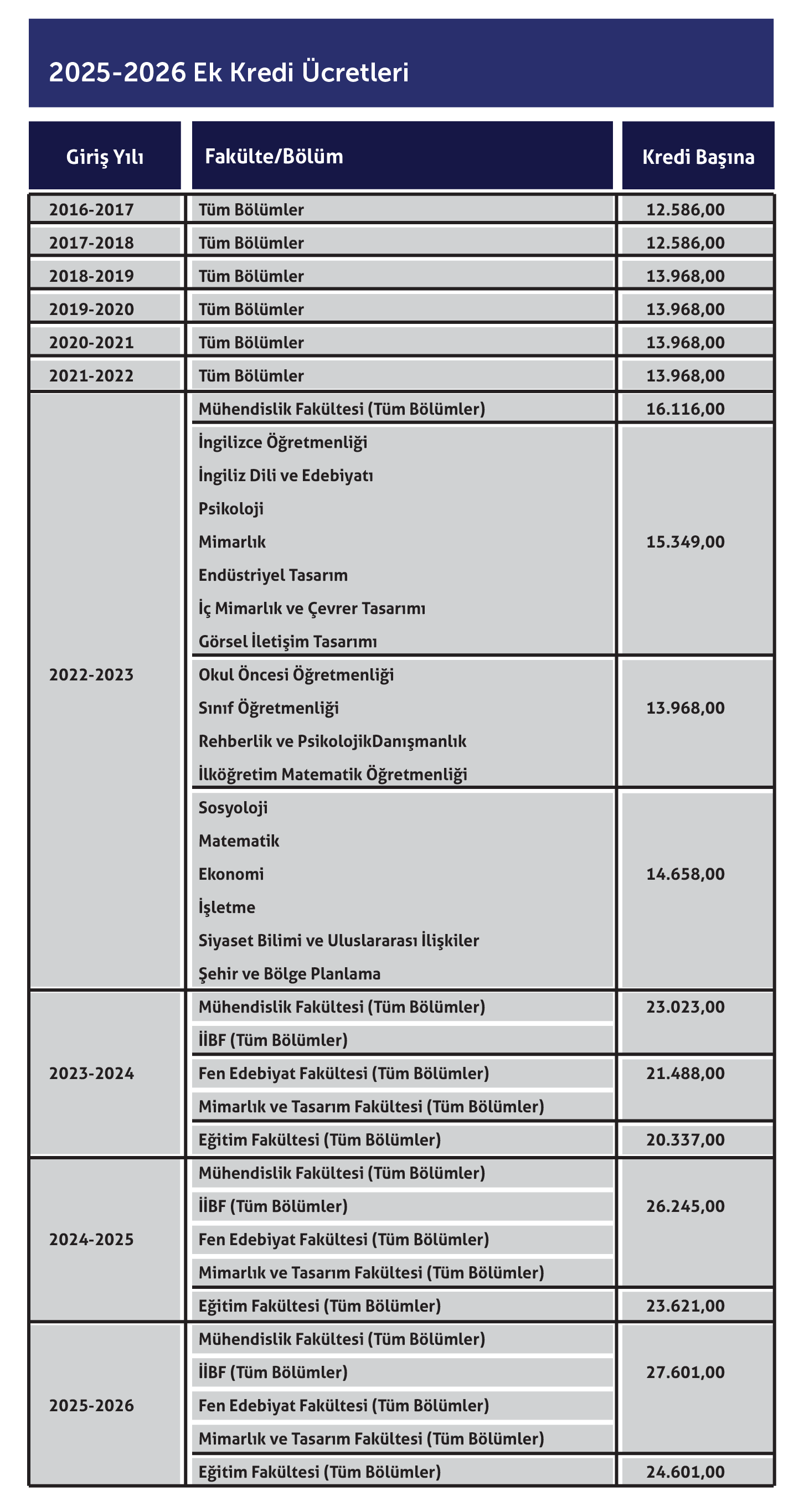 Giriş yılınıza ve bölümünüze göre, 20 krediden fazla almanız durumunda, kredi başına ödemeniz gereken ücretleri aşağıdaki tablolarda bulabilirsiniz.